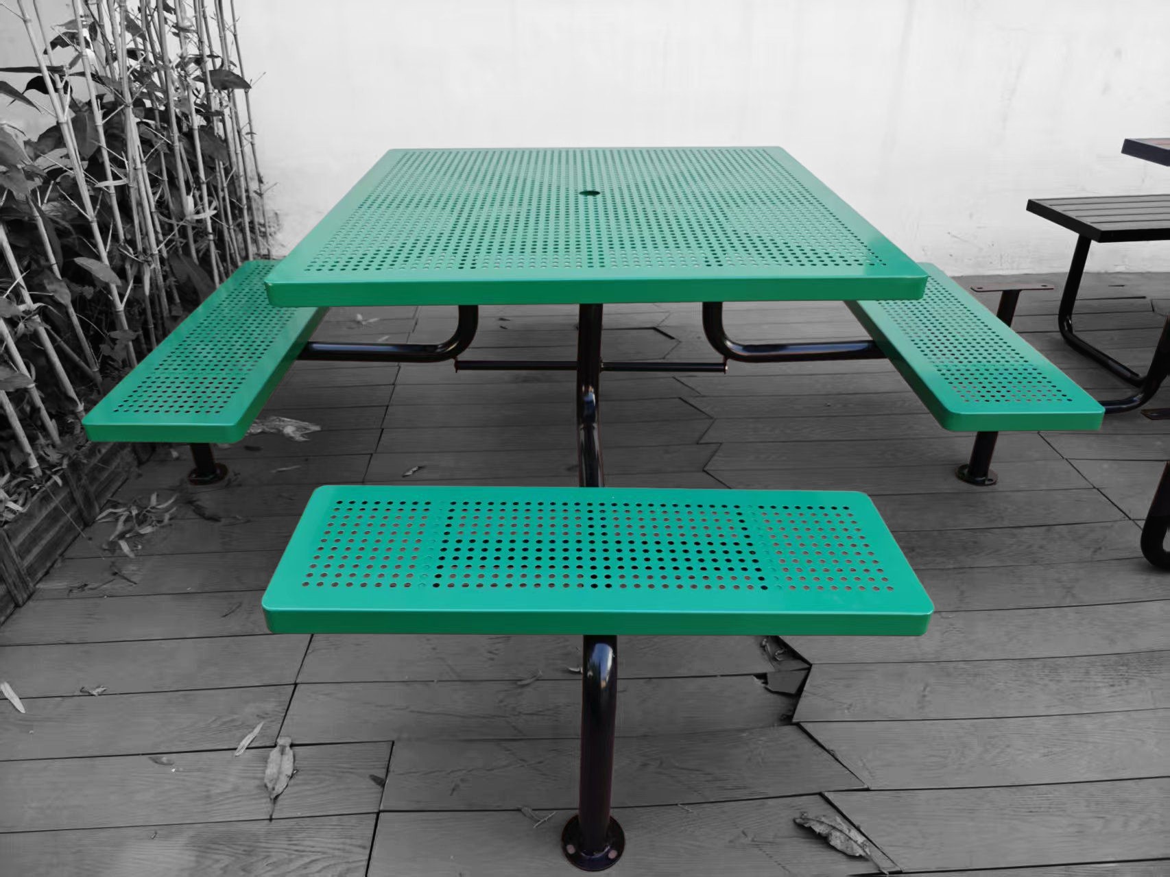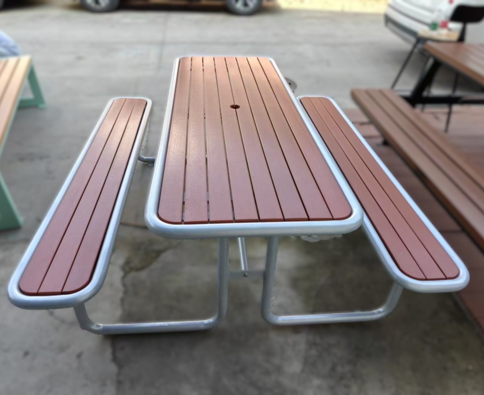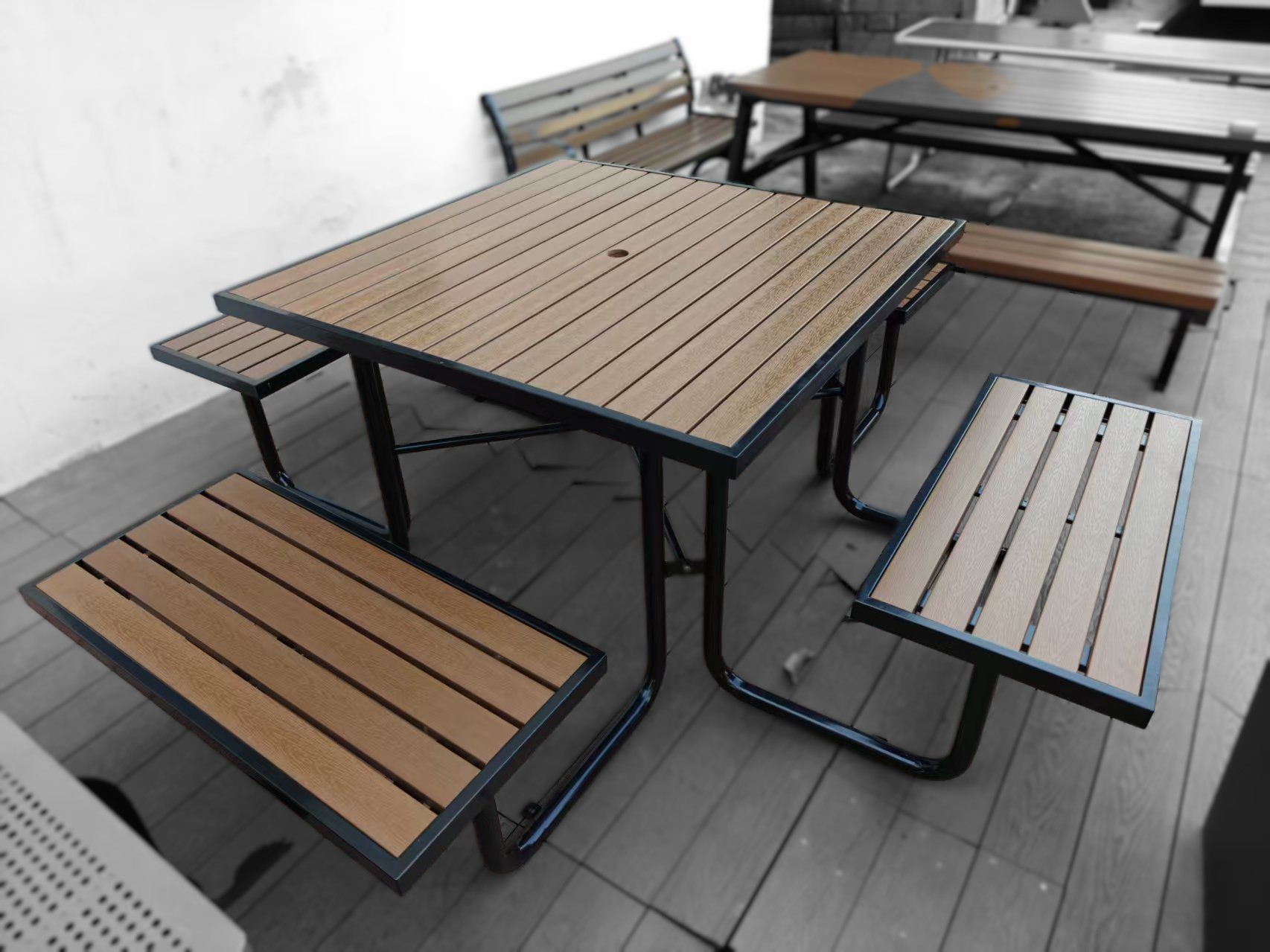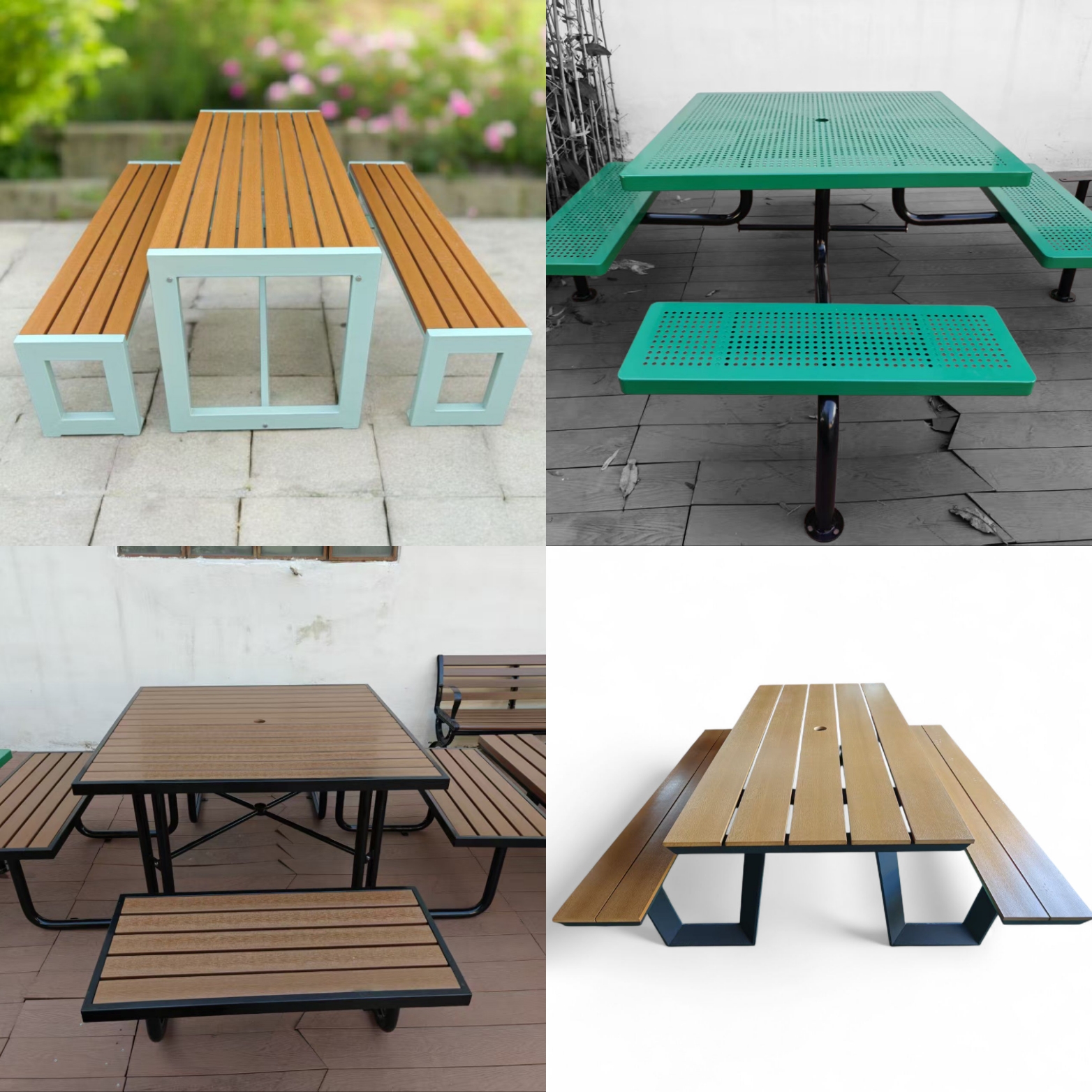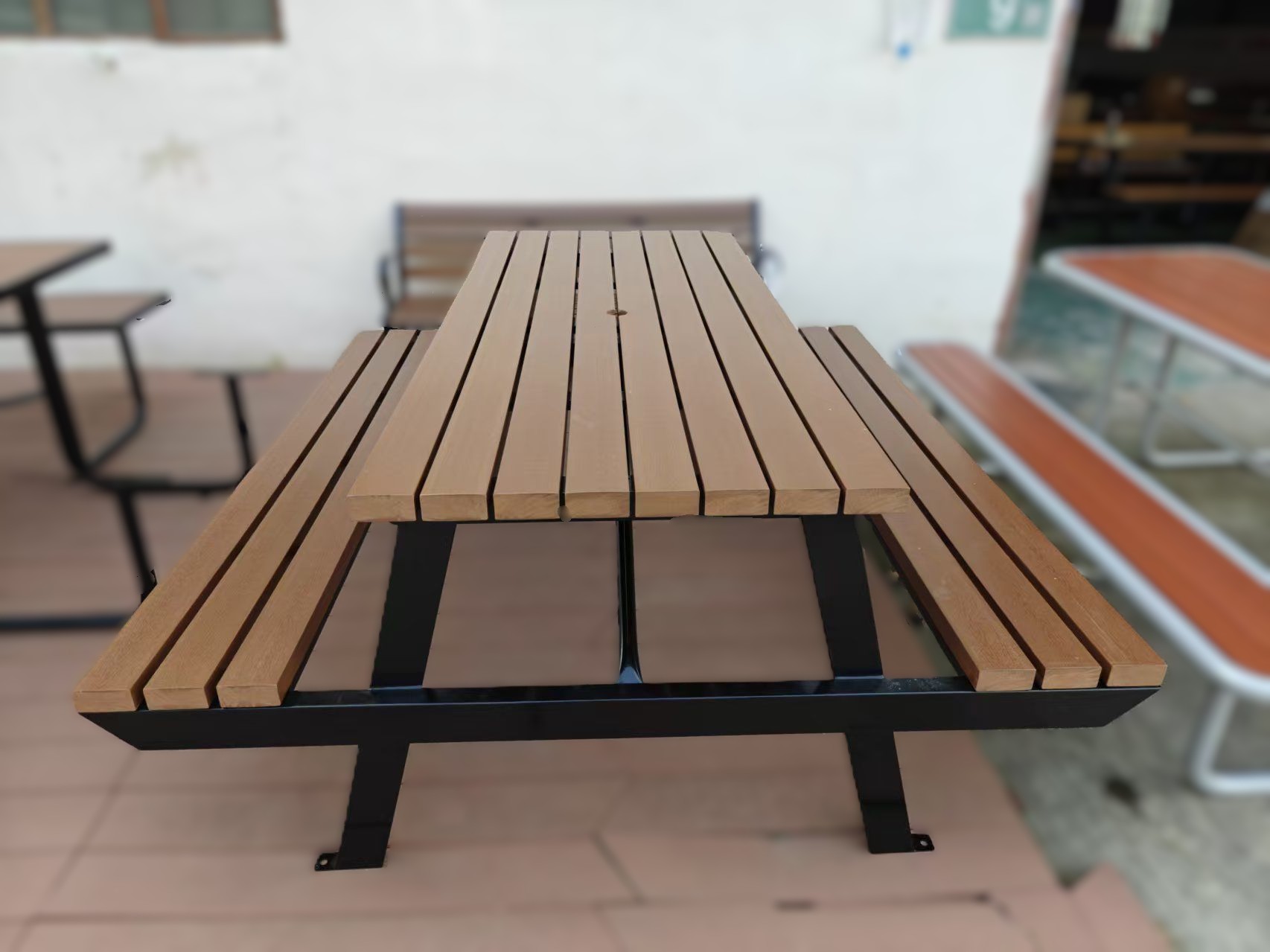 New metal‑frame picnic tables arriving soon — available in 6 and 8 seater formats with typical sizes: 1.8 m × 1.6 m and 2.0 m × 2.0 m. The powder coated steel frames come in a variety of shapes including the W‑shape, Square, A‑frame, and U‑shape. The new style tables will use low maintenance high durability composite timber or thermoplastic‑coated mesh on the table and seat tops. Optional centre umbrella holes.
